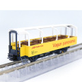 夏季にレーティッシュ鉄道で連結されるトロッコ形状のオープンパノラマ客車は赤色の車両が多いレーティッシュ鉄道でひときわ目立つ鮮やかな黄色が特徴的です。主に夏季の<ベルニナ急行>やベルニナ線の普通列車、臨時列車に連結され追加料金・予約なしでも乗車可能なことから高い人気を誇ります。 |